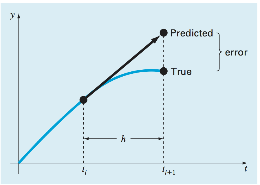 This is the so-called Euler Method, and you can interpret it as constructing a straight line between the two points. See the next figure, from Chapra. The local error is of order \(\delta t^2\) because we are ignoring first that term in the series expansion of \(y(t+\delta t)\).